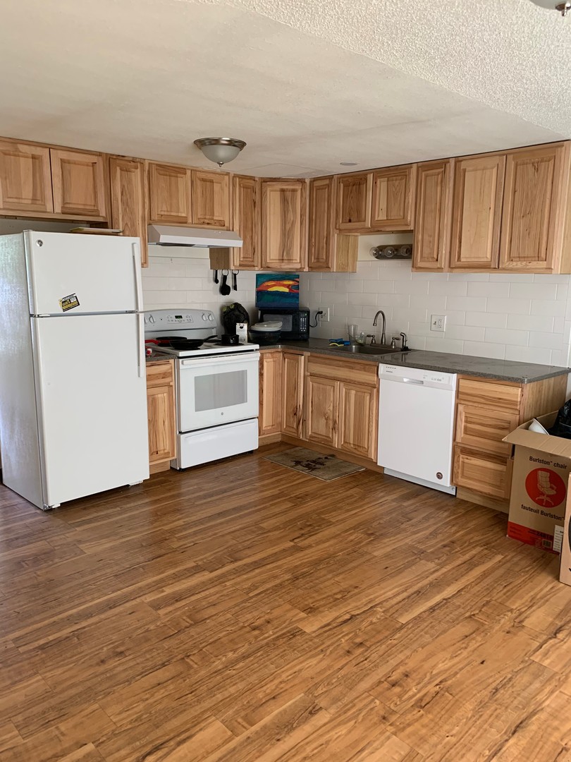Eat-in kitchen with electric range, refrigerator, and dishwasher